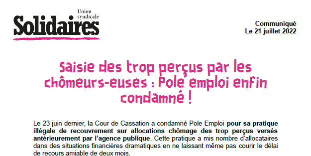 Solidaires espère que la Cour ne s’arrêtera pas là dans son intention de faire rentrer Pole Emploi dans les clous réglementaires et qu’elle la censurera à nouveau pour ses retenues sur allocation sans notification de contrainte ni même de mise en demeure. Et qu’elle étendra sa censure à l’encontre des CAF qui ne sont pas les dernières à recouvrer illégalement et en toute impunité des trop percus dans les allocations des populations les plus pauvres !