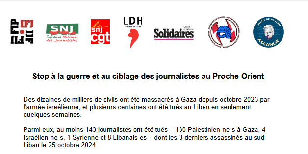 - exigeons l’ouverture de Gaza aux médias internationaux et la protection des journalistes, en commençant par l’évacuation d’urgence des journalistes blessés.