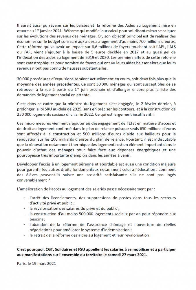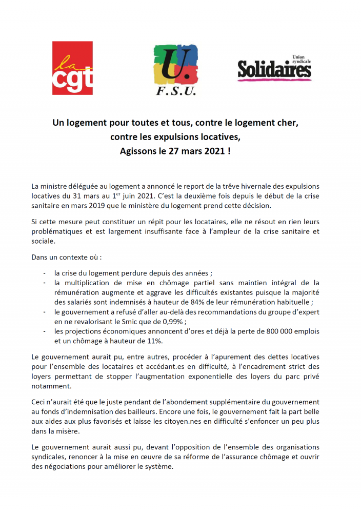 Un logement pour toutes et tous, contre le logement cher, contre les expulsions locatives, agissons le 27 mars !