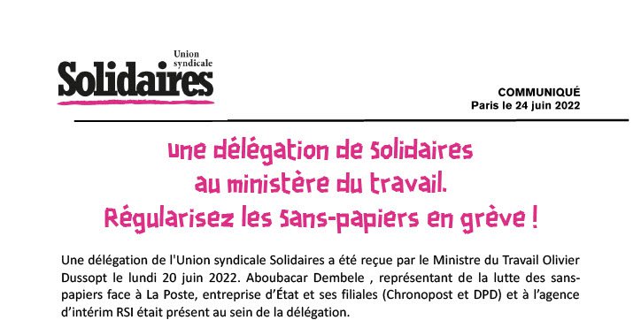 Une délégation de l'Union syndicale Solidaires a été reçue par le Ministre du Travail Olivier Dussopt le lundi 20 juin 2022. Aboubacar Dembele , représentant de la lutte des sans-papiers face à La Poste, entreprise d’État et ses filiales (Chronopost et DPD) et à l’agence d’intérim RSI était présent au sein de la délégation.