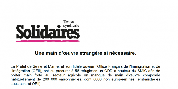Le Préfet de Seine et Marne, et son fidèle ouvrier l'Office Français de l'Immigration et de l'Intégration (OFII), ont su procurer à 56 réfugié·es un CDD à hauteur du SMIC afin de prêter main forte au secteur agricole en manque de main d’œuvre composée habituellement de 200 000 saisonnier·es, dont 8000 non européen·nes (embauché·es sous contrat OFII).