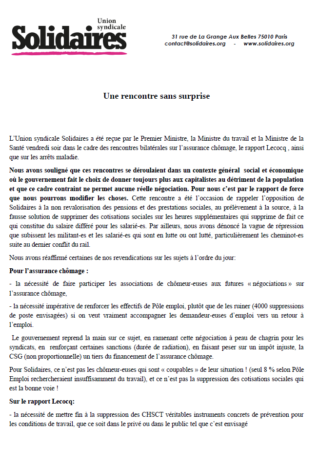 Nous avons souligné que ces rencontres se déroulaient dans un contexte général social et économique où le gouvernement fait le choix de donner toujours plus aux capitalistes au détriment de la population et que ce cadre contraint ne permet aucune réelle négociation. Pour nous c’est par le rapport de force que nous pourrons modifier les choses. Cette rencontre a été l’occasion de rappeler l’opposition de Solidaires à la non revalorisation des pensions et des prestations sociales, au prélèvement à la source, à la fausse solution de supprimer des cotisations sociales sur les heures supplémentaires qui supprime de fait ce qui constitue du salaire différé pour les salarié-es. Par ailleurs, nous avons dénoncé la vague de répression que subissent les militant-es et les salarié-es qui sont en lutte ou ont lutté, particulièrement les cheminot-es suite au dernier conflit du rail.