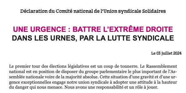 Le premier tour des élections législatives est un coup de tonnerre. Le Rassemblement national est en position de disposer du groupe parlementaire le plus important de l’Assemblée nationale voire de la majorité absolue. Cette situation d’une gravité et d’une urgence exceptionnelles engage notre union syndicale à adopter une attitude à la hauteur du danger qui nous menace. Nous avons une responsabilité et un rôle à jouer.