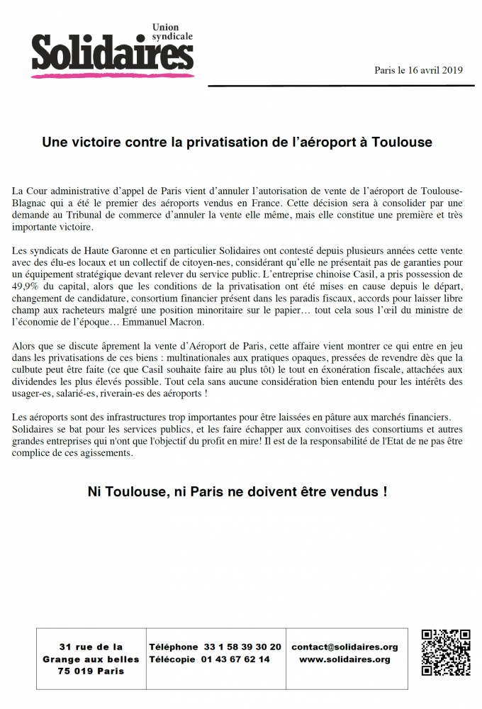 Les syndicats de Haute Garonne et en particulier Solidaires ont contesté depuis plusieurs années cette vente avec des élu-es locaux et un collectif de citoyen-nes, considérant qu’elle ne présentait pas de garanties pour un équipement stratégique devant relever du service public. L’entreprise chinoise Casil, a pris possession de 49,9% du capital, alors que les conditions de la privatisation ont été mises en cause depuis le départ, changement de candidature, consortium financier présent dans les paradis fiscaux, accords pour laisser libre champ aux racheteurs malgré une position minoritaire sur le papier… tout cela sous l’œil du ministre de l’économie de l’époque… Emmanuel Macron.