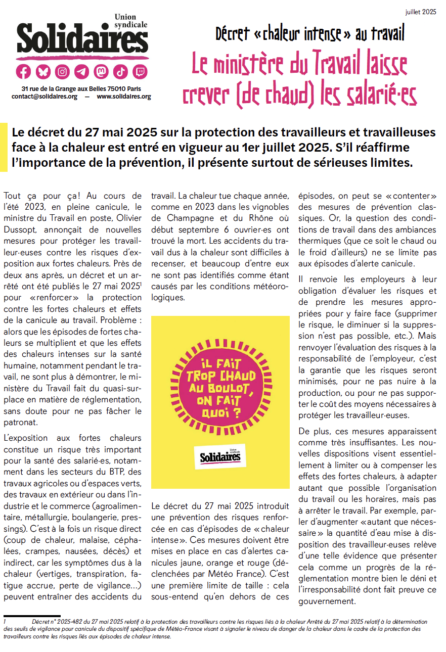 Tout ça pour ça ! Au cours de l’été 2023, en pleine canicule, le ministre du travail en poste, Olivier Dussopt, annonçait de nouvelles mesures pour protéger les travailleur·euses contre les risques d’exposition aux fortes chaleurs. Près de deux ans après, un décret et un arrêté ont été publiés le 27 mai 2025[1] pour « renforcer » la protection contre les fortes chaleurs et effets de la canicule au travail. Problème : alors que les épisodes de fortes chaleurs se multiplient et que les effets des chaleurs intenses sur la santé humaine, notamment pendant le travail, ne sont plus à démontrer, le ministère du travail fait du quasi-surplace en matière de réglementation, sans doute pour ne pas fâcher le patronat.