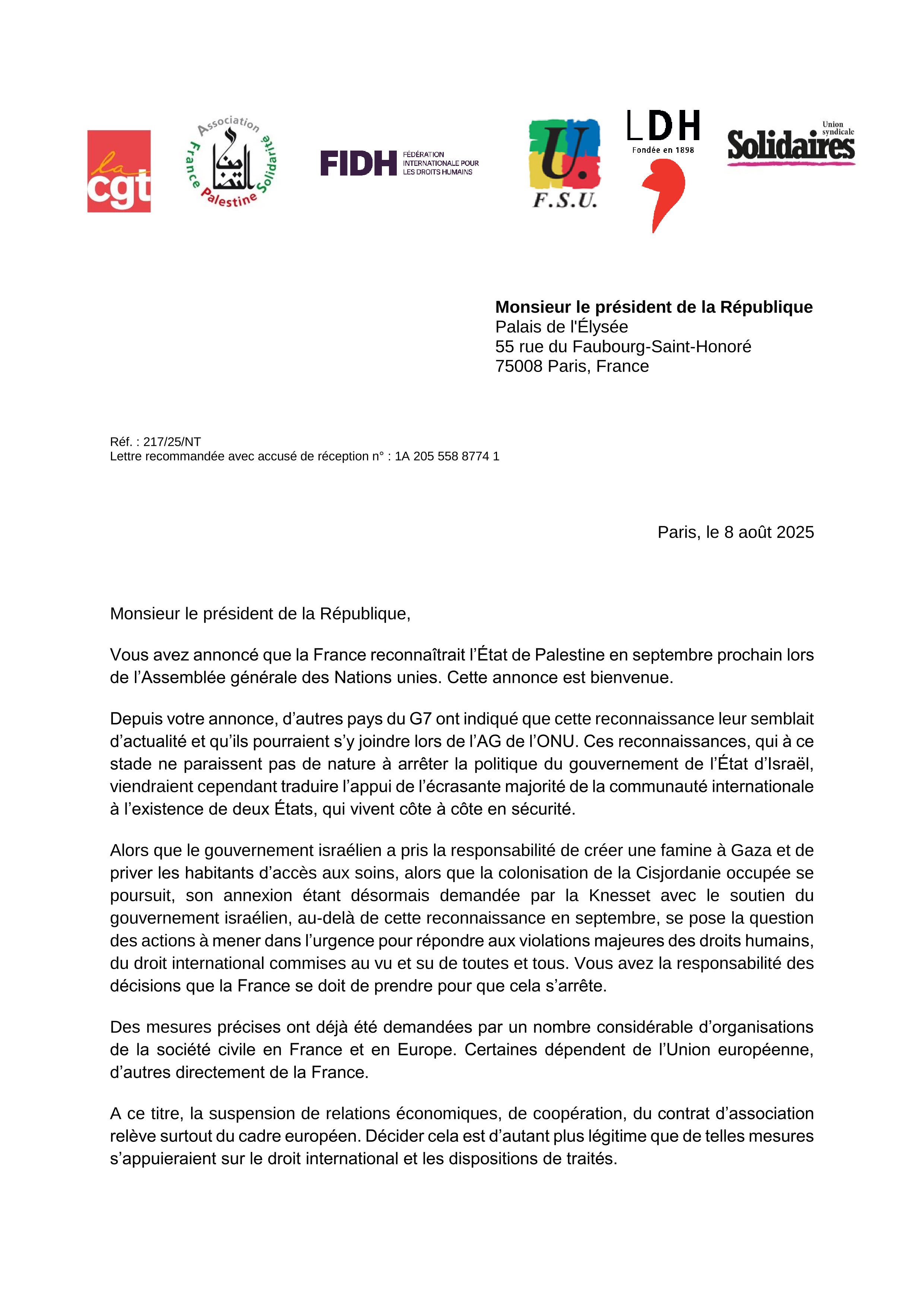 Alors que le gouvernement israélien a pris la responsabilité de créer une famine à Gaza et de priver les habitants d’accès aux soins, alors que la colonisation de la Cisjordanie occupée se poursuit, son annexion étant désormais demandée par la Knesset avec le soutien du gouvernement israélien, au-delà de cette reconnaissance en septembre, se pose la question des actions à mener dans l’urgence pour répondre aux violations majeures des droits humains, du droit international commises au vu et su de toutes et tous. Vous avez la responsabilité des décisions que la France se doit de prendre pour que cela s’arrête.
