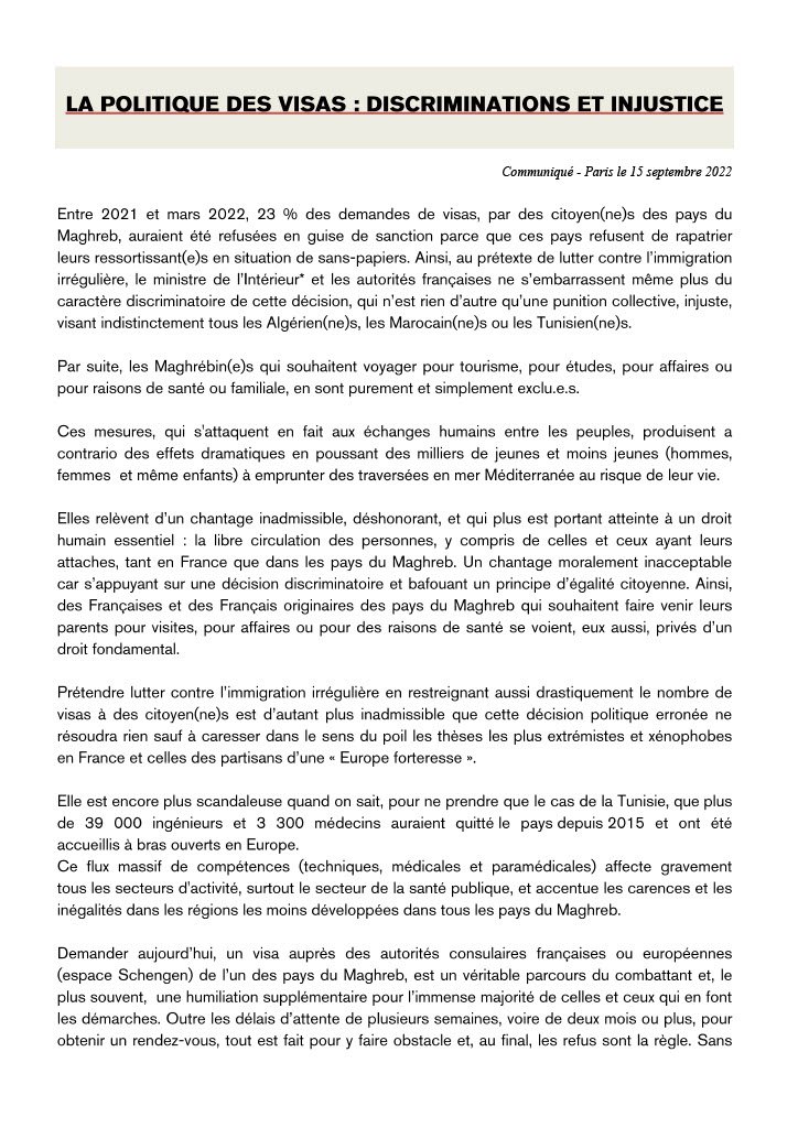 Elles relèvent d’un chantage inadmissible, déshonorant, et qui plus est portant atteinte à un droit humain essentiel : la libre circulation des personnes, y compris de celles et ceux ayant leurs attaches, tant en France que dans les pays du Maghreb. Un chantage moralement inacceptable car s’appuyant sur une décision discriminatoire et bafouant un principe d’égalité citoyenne. Ainsi, des Françaises et des Français originaires des pays du Maghreb qui souhaitent faire venir leurs parents pour visites, pour affaires ou pour des raisons de santé se voient, eux aussi, privés d’un droit fondamental.
