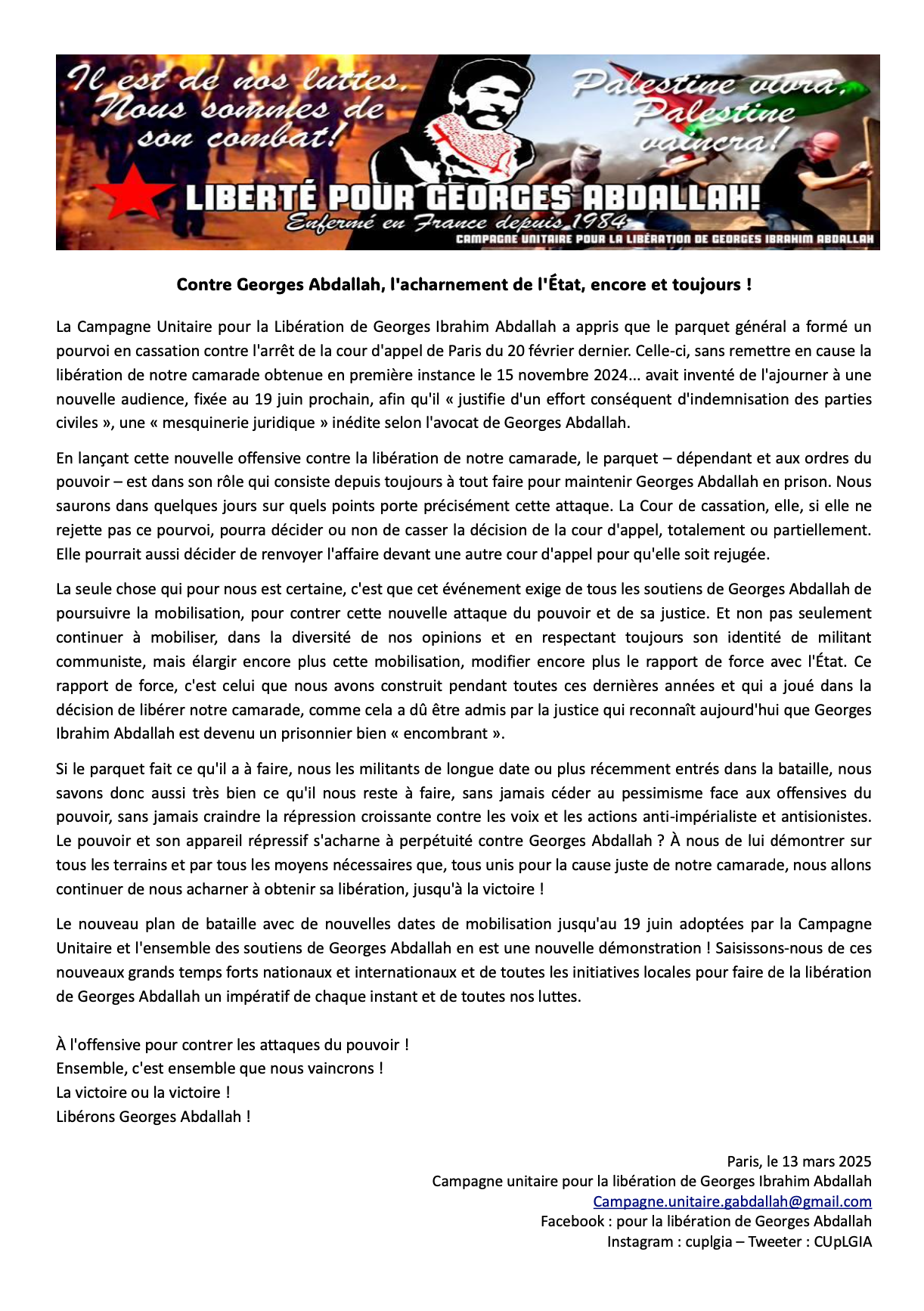 Le nouveau plan de bataille avec de nouvelles dates de mobilisation jusqu'au 19 juin adoptées par la Campagne Unitaire et l'ensemble des soutiens de Georges Abdallah en est une nouvelle démonstration ! Saisissons-nous de ces nouveaux grands temps forts nationaux et internationaux et de toutes les initiatives locales pour faire de la libération de Georges Abdallah un impératif de chaque instant et de toutes nos luttes.