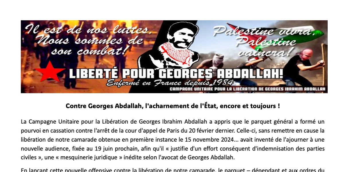 La Campagne Unitaire pour la Libération de Georges Ibrahim Abdallah a appris que le parquet général a formé un pourvoi en cassation contre l'arrêt de la cour d'appel de Paris du 20 février dernier. Celle-ci, sans remettre en cause la libération de notre camarade obtenue en première instance le 15 novembre 2024... avait inventé de l'ajourner à une nouvelle audience, fixée au 19 juin prochain, afin qu'il « justifie d'un effort conséquent d'indemnisation des parties civiles », une « mesquinerie juridique » inédite selon l'avocat de Georges Abdallah.