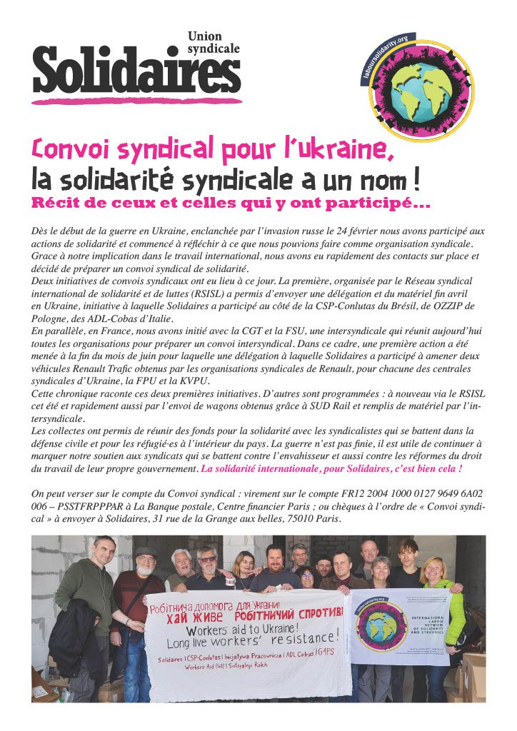 Depuis le mois de mars, une démarche intersyndicale a été engagée et réunit aujourd’hui toutes les organisations syndicales françaises (https://solidaires.org/sinformer-et-agir/actualites-et-mobilisations/communiques/un-convoi-intersyndical-pour-lukraine-appel-unitaire-des-organisations-syndicales-francaises/ https://solidaires.org/sinformer-et-agir/actualites-et-mobilisations/internationales/un-convoi-intersyndical-pour-lukraine-point-detape/ ).