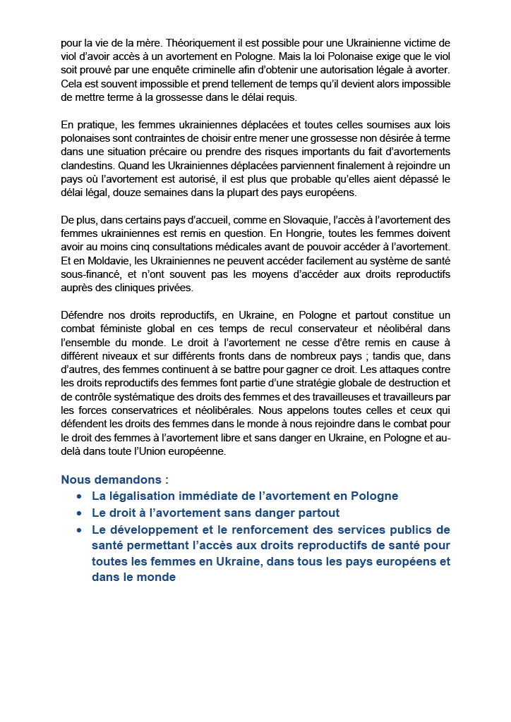 Défendre nos droits reproductifs, en Ukraine, en Pologne et partout constitue un combat féministe global en ces temps de recul conservateur et néolibéral dans l’ensemble du monde. Le droit à l’avortement ne cesse d’être remis en cause à différent niveaux et sur différents fronts dans de nombreux pays ; tandis que, dans d’autres, des femmes continuent à se battre pour gagner ce droit. Les attaques contre les droits reproductifs des femmes font partie d’une stratégie globale de destruction et de contrôle systématique des droits des femmes et des travailleuses et travailleurs par les forces conservatrices et néolibérales. Nous appelons toutes celles et ceux qui défendent les droits des femmes dans le monde à nous rejoindre dans le combat pour le droit des femmes à l’avortement libre et sans danger en Ukraine, en Pologne et au-delà dans toute l’Union européenne.