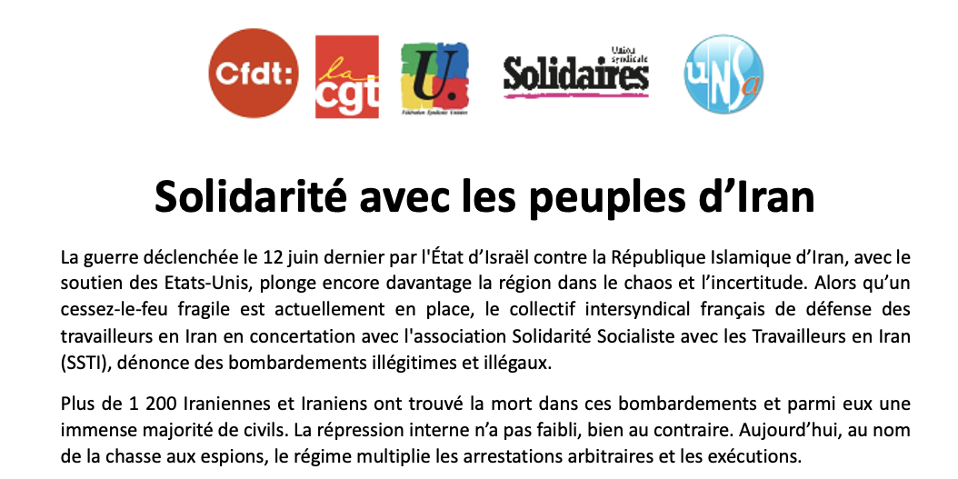 Nous condamnons fermement toute attaque militaire menée en violation des traités et conventions internationales. Nos organisations syndicales continueront de dénoncer le harcèlement visant celles et ceux qui, en Iran, luttent pour la liberté, la justice sociale et les droits syndicaux.