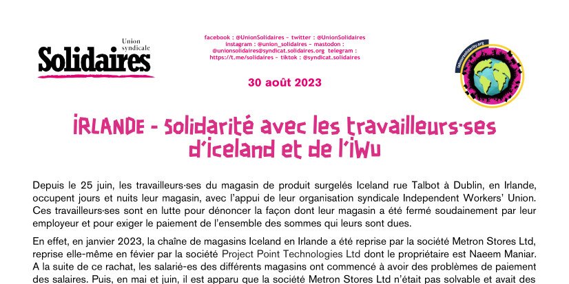 L’union syndicale Solidaires est aux côtés des travailleurs·ses d’Iceland et de l’IWU.