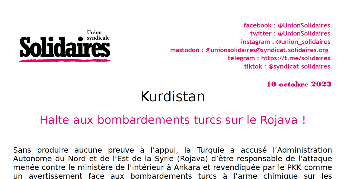 L’Union syndicale Solidaires réaffirme son soutien aux habitant.es du Rojava et au mouvement de libération kurde, et condamne les crimes du régime turc contre la population civile.