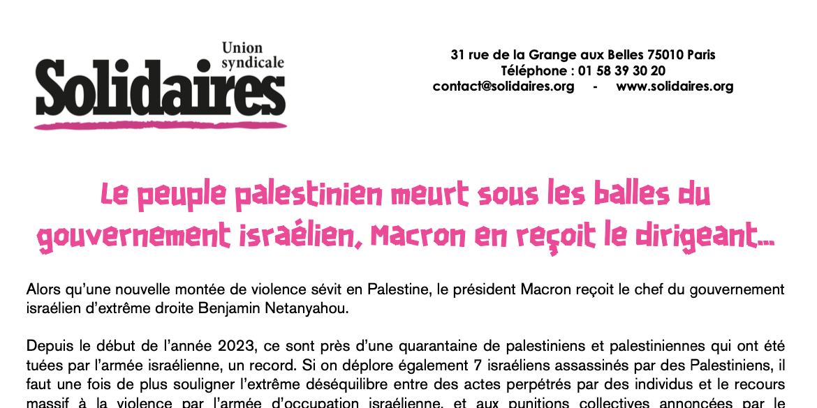 Alors qu’une nouvelle montée de violence sévit en Palestine, le président Macron reçoit le chef du gouvernement israélien d’extrême droite Benjamin Netanyahou.
