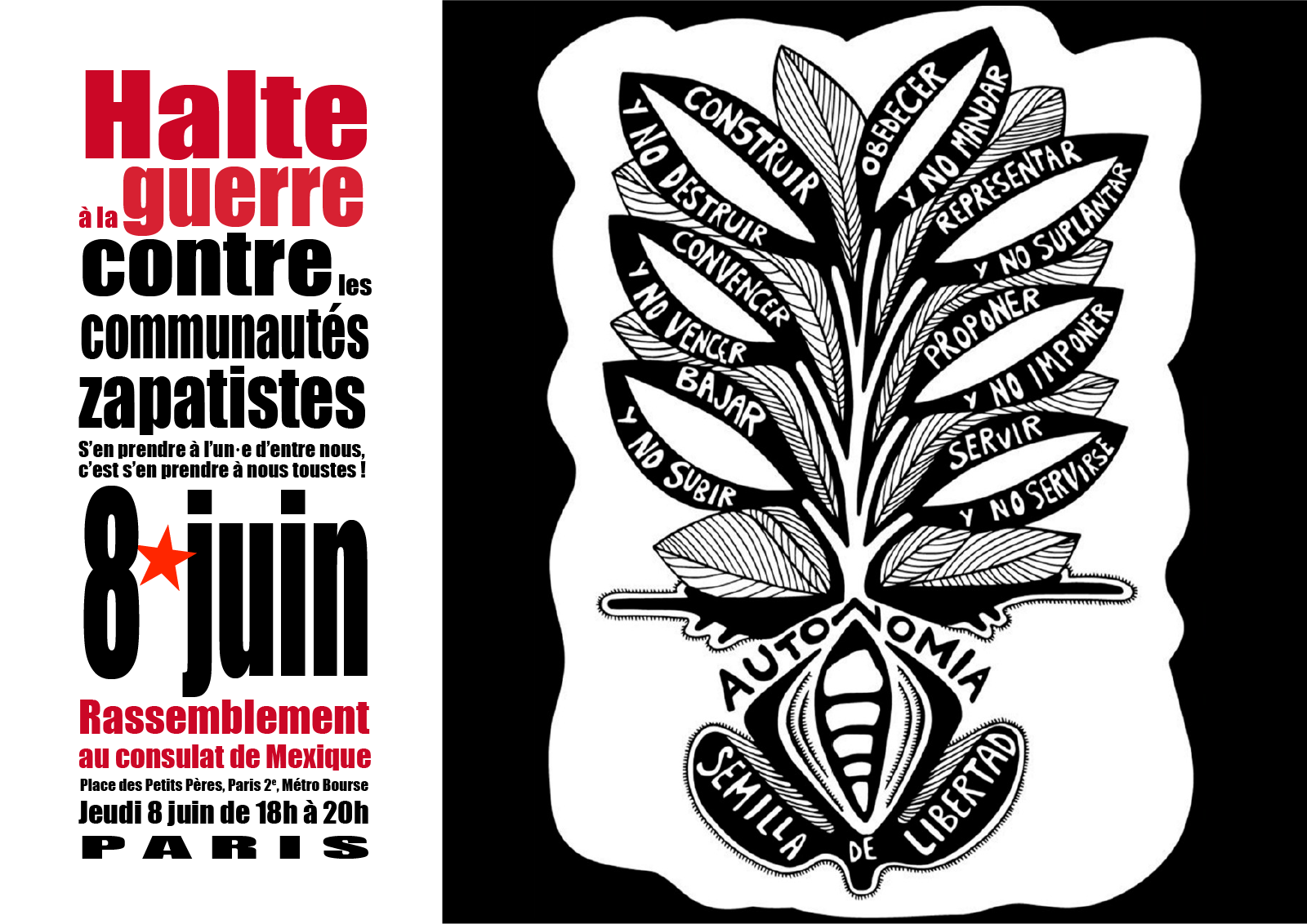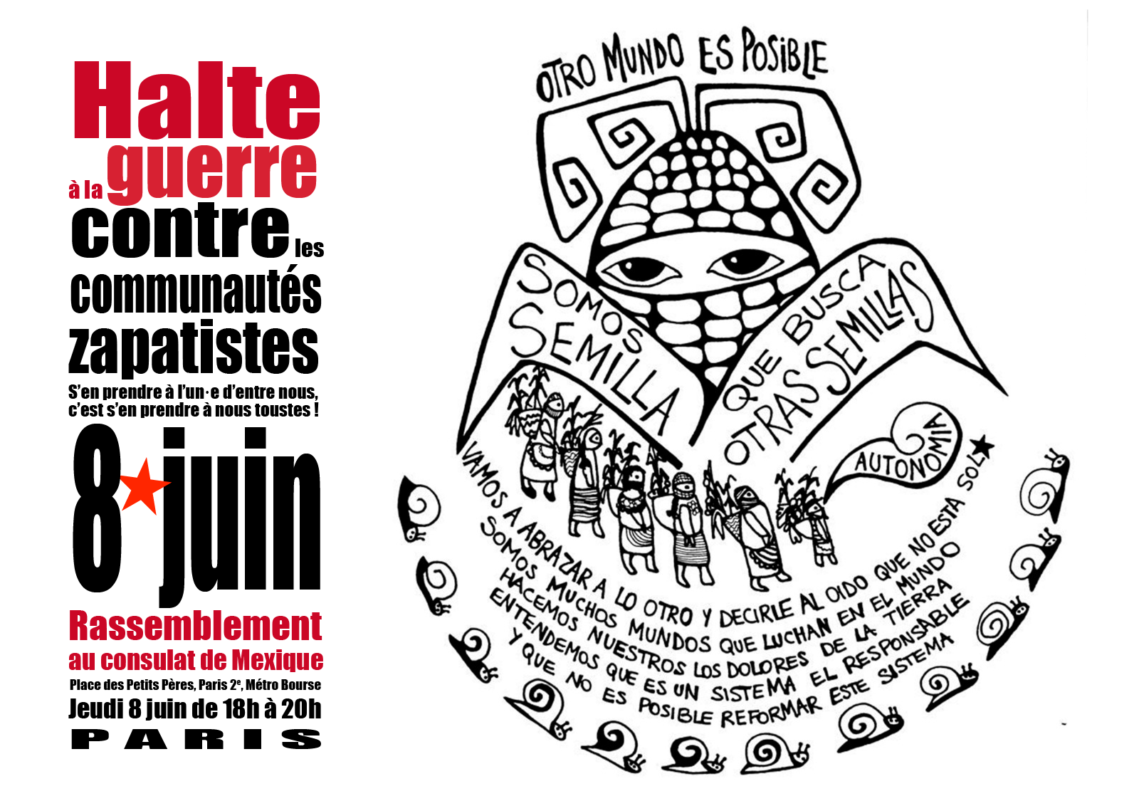 Nous appelons à unir nos efforts pour tisser une journée d’action diffuse, du 27 mai au 10 juin, avec une action coordonnée nationale et internationale le 8 juin.De même, nous exigeons la libération immédiate de Manuel Gómez, appui de l’EZLN, dont nous n’oublions pas l’injuste incarcération.