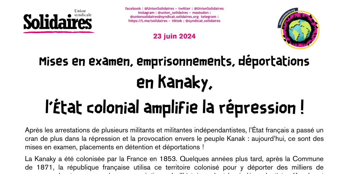 - affirme sa solidarité avec le peuple kanak et avec toutes les victimes (et leurs proches) de la répression exercée, sur différents plans, par l’État français,