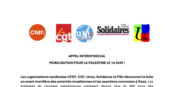 Nous saluons les initiatives multiples en France et dans le monde, y compris en Israël, qui dénoncent cette guerre. Nous appelons à nous mobiliser massivement le 14 juin à Paris et partout en France, dans le cadre du week-end mondial de mobilisations, pour un cessez-le-feu immédiat à Gaza et pour un accès sans entraves de l’aide humanitaire.