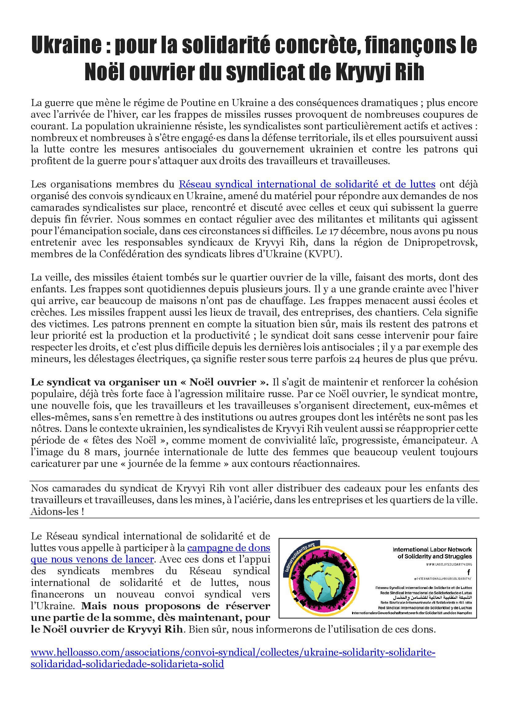 Le Réseau syndical international de solidarité et de luttes vous appelle à participer à la campagne de dons que nous venons de lancer. Avec ces dons et l’appui des syndicats membres du Réseau syndical international de solidarité et de luttes, nous financerons un nouveau convoi syndical vers l’Ukraine. Mais nous proposons de réserver une partie de la somme, dès maintenant, pour le Noël ouvrier de Kryvyi Rih. Bien sûr, nous informerons de l’utilisation de ces dons.