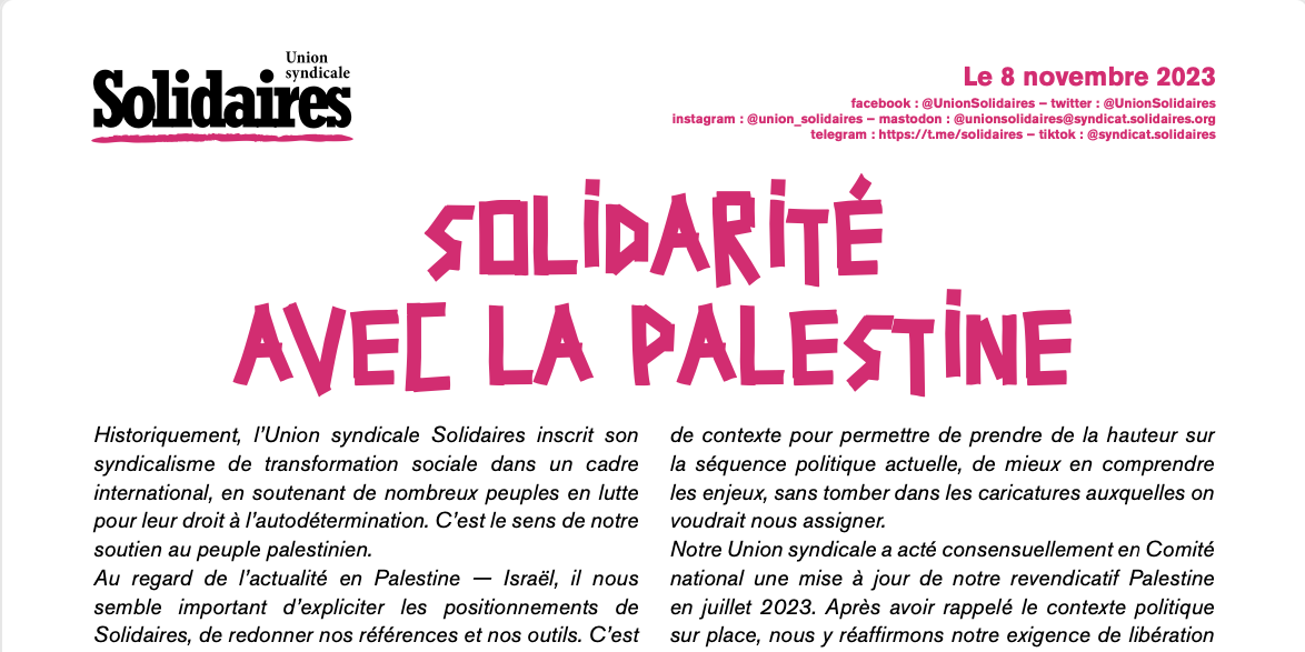 - Un revendicatif récent a été mis à jour que vous pouvez trouver là : https://solidaires.org/sinformer-et-agir/les-journaux-et-bulletins/solidaires-et-internationalistes/n120-special-palestine/.