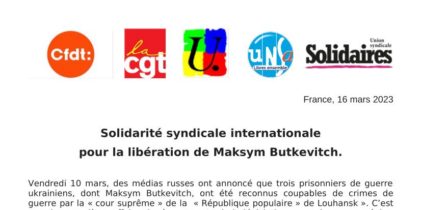 Les organisations syndicales françaises, CFDT, CGT, FSU, UNSA et Solidaires, agissent ensemble depuis un an pour soutenir le peuple ukrainien face à l’agression russe. C’est dans ce cadre qu’elles appellent à la solidarité syndicale internationale pour la libération de Maksym Butkevitch.