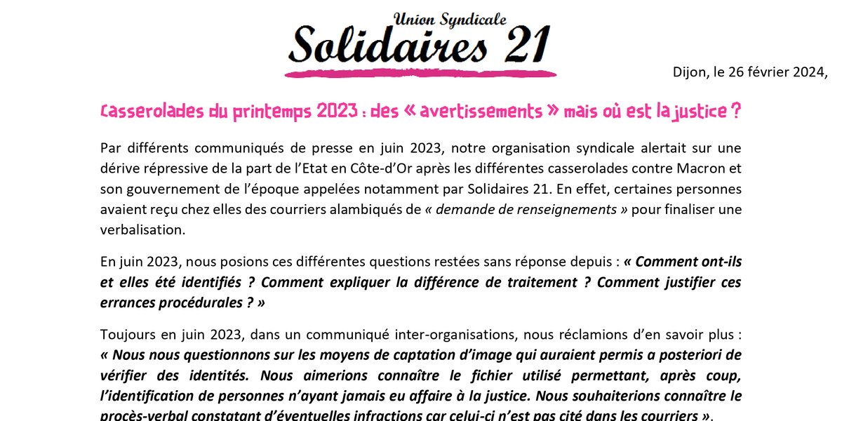 Par différents communiqués de presse en juin 2023, notre organisation syndicale alertait sur une dérive répressive de la part de l’Etat en Côte-d’Or après les différentes casserolades contre Macron et son gouvernement de l’époque appelées notamment par Solidaires 21. En effet, certaines personnes avaient reçu chez elles des courriers alambiqués de « demande de renseignements » pour finaliser une verbalisation.