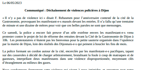 Ce samedi, la police a encore fait preuve d’un zèle extrême envers les manifestant-e-s venu protester contre le projet de loi de réforme des retraites devant la Cité de la Gastronomie de Dijon à 10h. Les protestataires n’étaient pas les bienvenus pour la petite sauterie organisée dans l’opulence par la mairie de Dijon, loin des réalités des Dijonnais-e-s qui peinent à boucler les fins de mois.