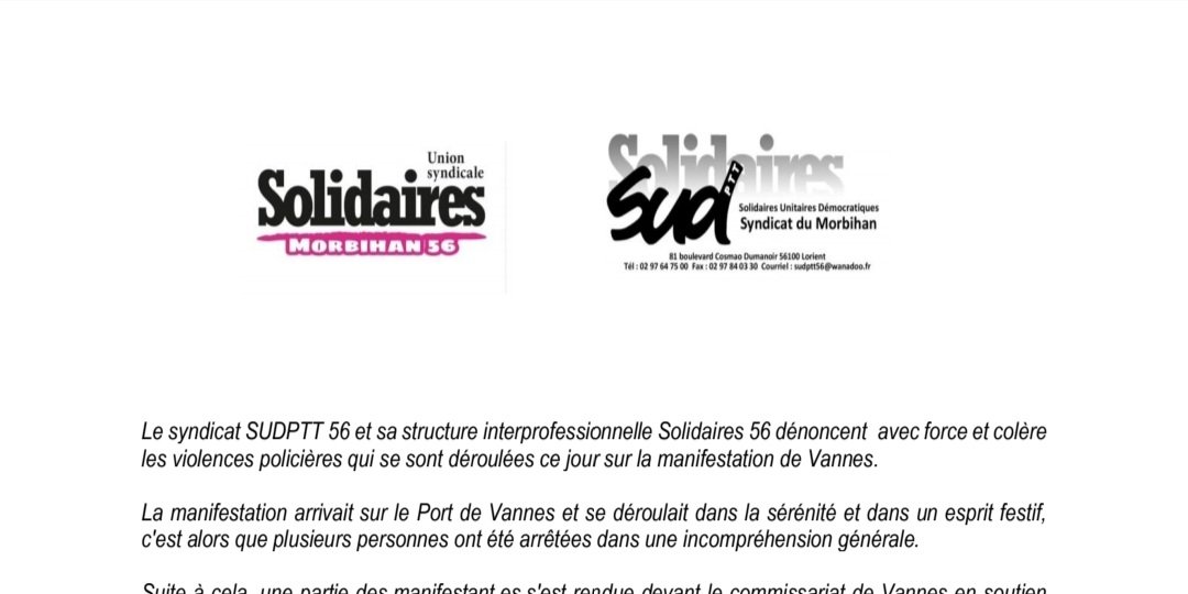 Communiqué Solidaires 56 - Violences policières manifestation de Vannes