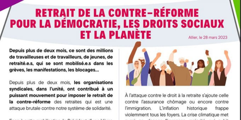 Déclaration unitaire des organisations Syndicales, associatives et politiques de l'Allier pour le retrait de la contre-réforme des retraites, pour la démocratie, les droit sociaux et la planète :