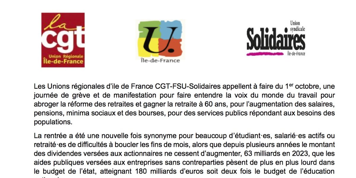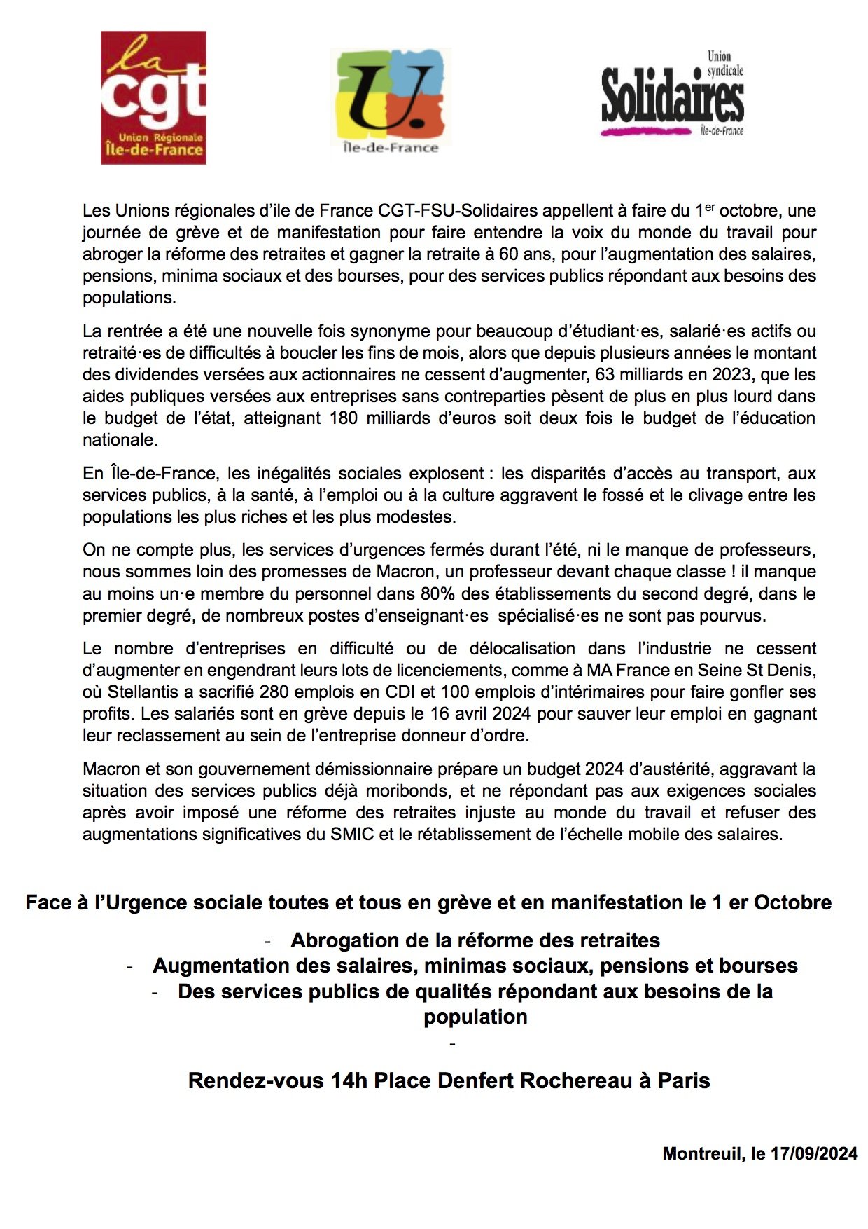 Face à l’urgence sociale toutes et tous en grève et en manifestation le 1er octobre