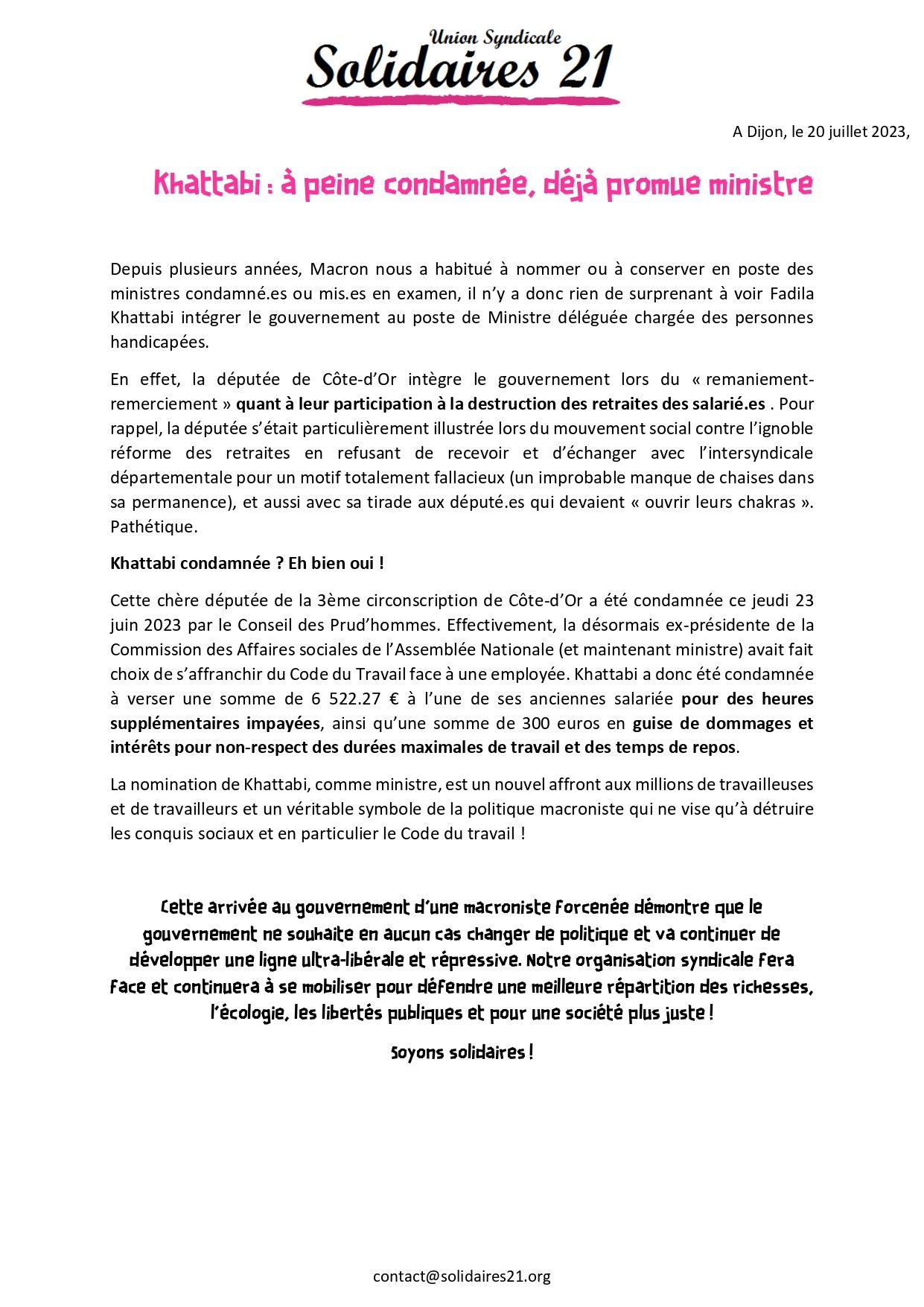 Cette chère députée de la 3ème circonscription de Côte-d’Or a été condamnée ce jeudi 23 juin 2023 par le Conseil des Prud’hommes. Effectivement, la désormais ex-présidente de la Commission des Affaires sociales de l’Assemblée Nationale (et maintenant ministre) avait fait choix de s’affranchir du Code du Travail face à une employée. Khattabi a donc été condamnée à verser une somme de 6 522.27 € à l’une de ses anciennes salariée pour des heures supplémentaires impayées, ainsi qu’une somme de 300 euros en guise de dommages et intérêts pour non-respect des durées maximales de travail et des temps de repos.