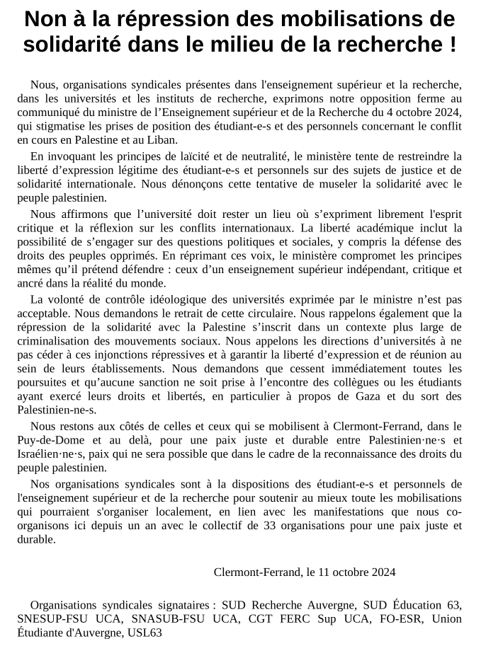 Organisations syndicales signataires : SUD Recherche Auvergne, SUD Éducation 63, SNESUP-FSU UCA, SNASUB-FSU UCA, CGT FERC Sup UCA, FO-ESR, Union Étudiante d'Auvergne, USL63