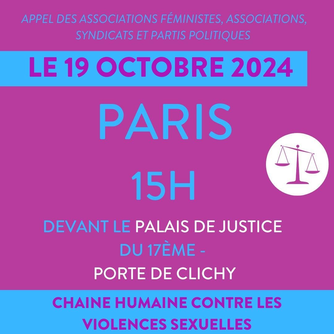 Le 19 octobre nous serons à nouveau unies et mobilisées pour montrer que nous sommes déterminées à mettre un terme aux violences sexuelles par des rassemblements et des chaînes humaines devant tous les Palais de Justice.