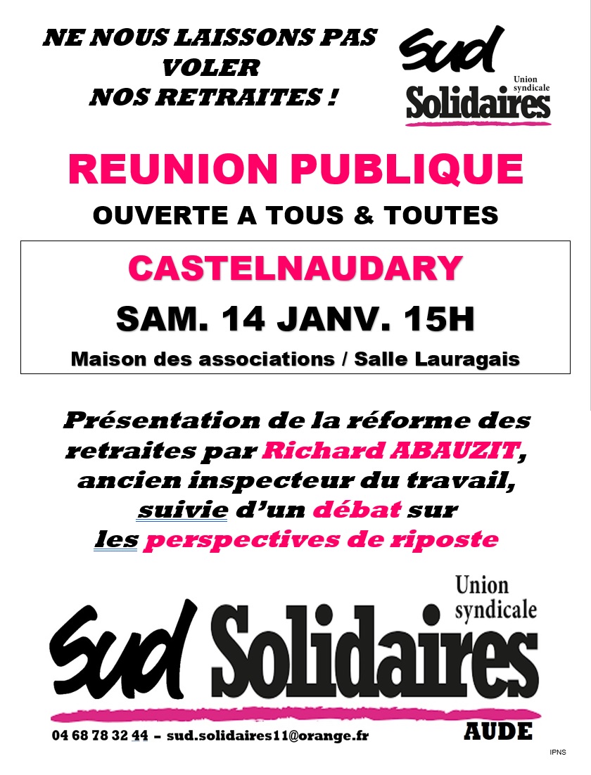 Le samedi 14 janvier à 15h à la Maison des Associations à Castelnaudary, réunion publique où la présentation de cette réforme par Richard Abauzit, ancien inspecteur du travail, sera suivi d'un débat sur les perspectives de ripostes.