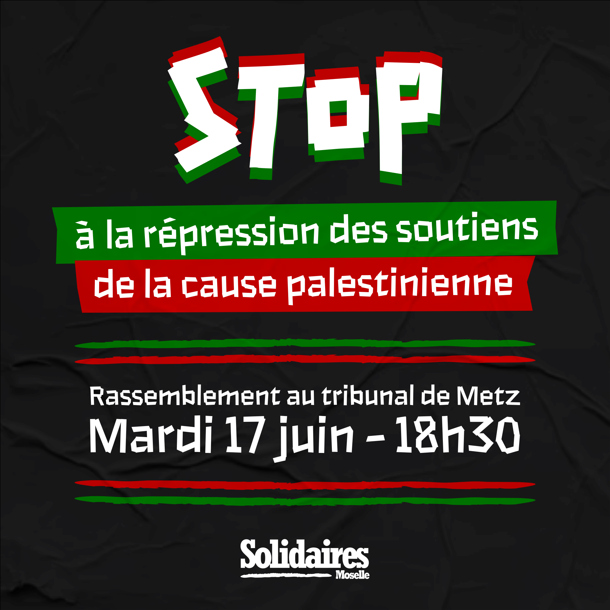 Stop à la répression des soutiens à la cause palestinienne Rassemblement devant le Tribunal de Metz 17 juin 18h30