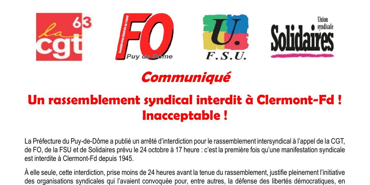 La Préfecture du Puy-de-Dôme a publié un arrêté d’interdiction pour le rassemblement intersyndical à l’appel de la CGT, de FO, de la FSU et de Solidaires prévu le 24 octobre à 17 heure : c’est la première fois qu’une manifestation syndicale est interdite à Clermont-Fd depuis 1945.
