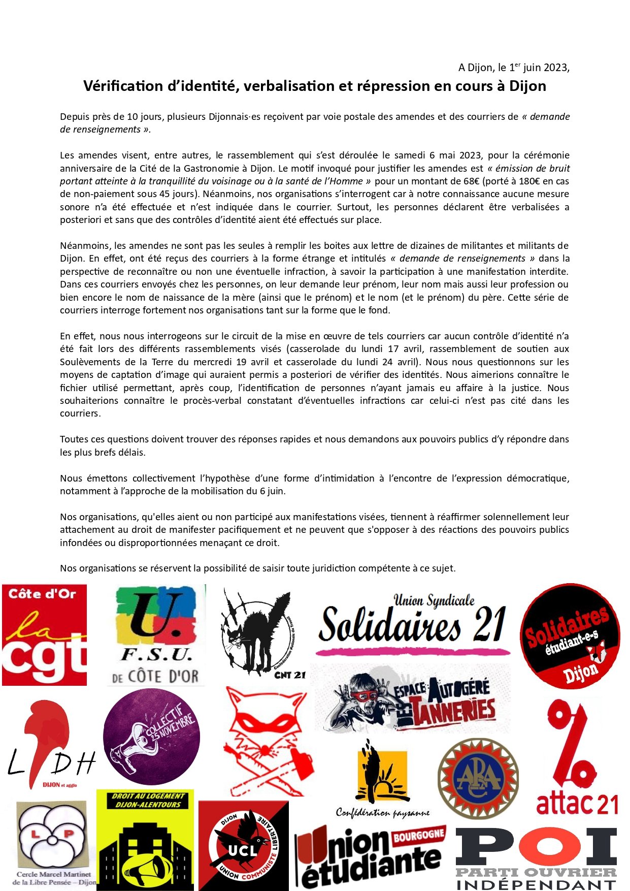 Les amendes visent, entre autres, le rassemblement qui s’est déroulée le samedi 6 mai 2023, pour la cérémonie anniversaire de la Cité de la Gastronomie à Dijon. Le motif invoqué pour justifier les amendes est « émission de bruit portant atteinte à la tranquillité du voisinage ou à la santé de l’Homme » pour un montant de 68€ (porté à 180€ en cas de non-paiement sous 45 jours). Néanmoins, nos organisations s’interrogent car à notre connaissance aucune mesure sonore n’a été effectuée et n’est indiquée dans le courrier. Surtout, les personnes déclarent être verbalisées a posteriori et sans que des contrôles d’identité aient été effectués sur place.