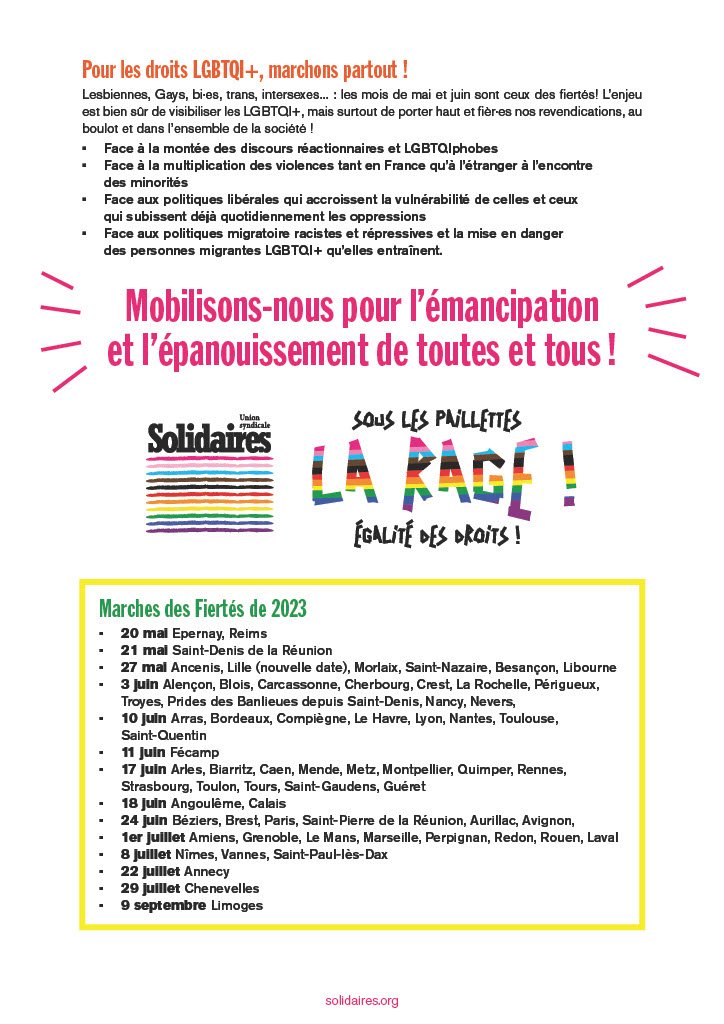Lesbiennes, Gays, bi·es, trans, intersexes, ... : les mois de mai et juin sont ceux des fiertés! L’enjeu est bien sûr de visibiliser les LGBTQI+, mais surtout de porter haut et fièr·es nos revendications, au boulot et dans l’ensemble de la société !