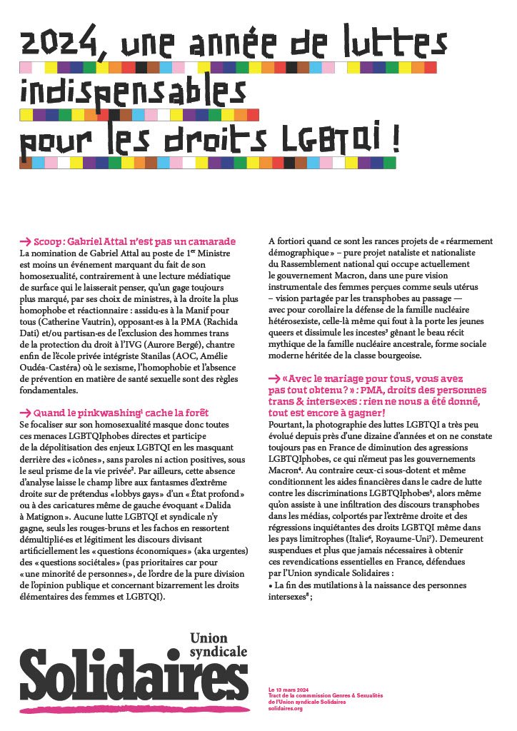 Les droits LGBTQI concernent donc tout le champ syndical des luttes, pour défendre et renforcer le droit des femmes, des migrant·es qui composent les rangs des travailleur·ses, ici et ailleurs, qui n’en peuvent plus des conditions de travail sous les insultes et ambiances hétérosexistes. L’agenda de nos luttes est rempli face aux menaces fascistes, racistes, LGBTQIphobes et misogynes, mais toutes celles-ci rentrent en résonance.