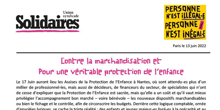 Le 17 Juin auront lieu les Assises de la Protection de l’Enfance à Nantes, où sont attendu-es plus d’un millier de professionnel-les, mais aussi de décideurs, de financeurs du secteur, de spécialistes qui n’ont de cesse d’expliquer que la Protection de l’Enfance est sacrée, mais qu’elle a un coût et qu’il vaut mieux privilégier l’accompagnement bon marché – voire bénévole – les nouveaux dispositifs marchandisables ou bien le fichage et le contrôle, afin de circonscrire les budgets. Derrière cette logique comptable, ornée d’envolées lyriques, se cache la triste réalité : des enfants et jeunes majeur-es livré-es à la précarité et au manque de soins au moindre prétexte. Nous serons au rendez-vous, à Nantes, et dans d’autres villes pour rappeler la triste réalité et les moyens pour en sortir.