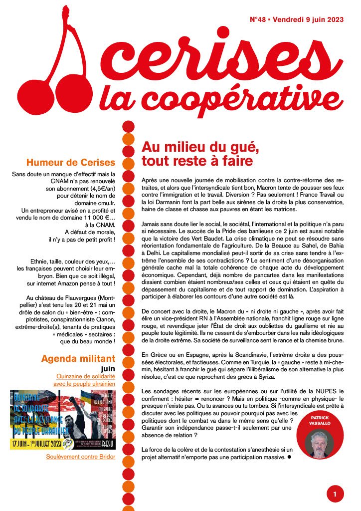 En ce mois de juin où les médias mainstream “passent à la suite” (la suite d’une lutte puissante qu’ils voudraient oublier) l’édito de Cerises donne le ton : “Au milieu du gué, tout reste à faire”. Et le dossier de nos “Horizons d’Émancipation” pointe la direction de ce “tout reste à faire” : reprendre la main sur notre travail. Ophélie Gath du Secrétariat national Solidaires et Nara Cladera de la fédération SUD Education ont participé au débat support de ce dossier.