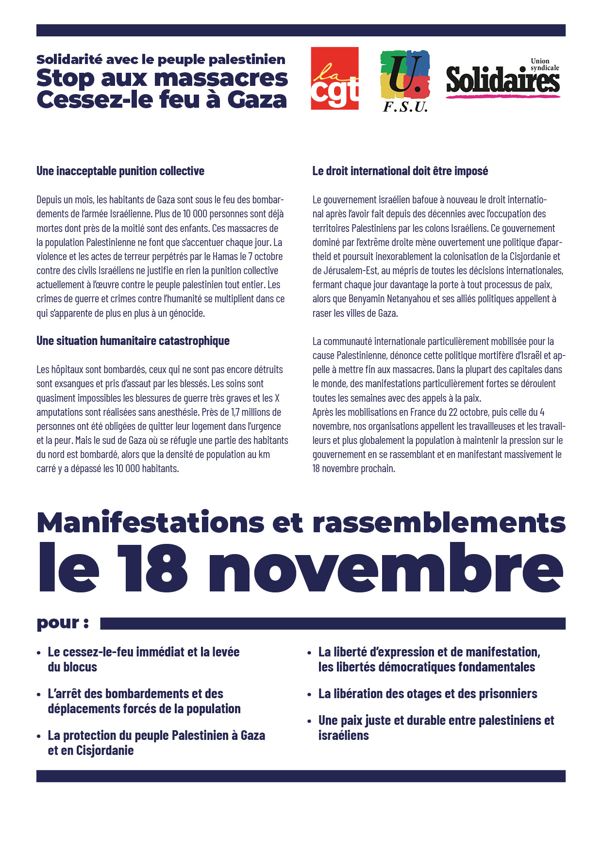 CGT/FSU/Solidaires - Solidarité avec le peuple palestinien. Stop aux massacres. Cessez-le feu à Gaza : Manifestations et rassemblements le 18 novembre 2023