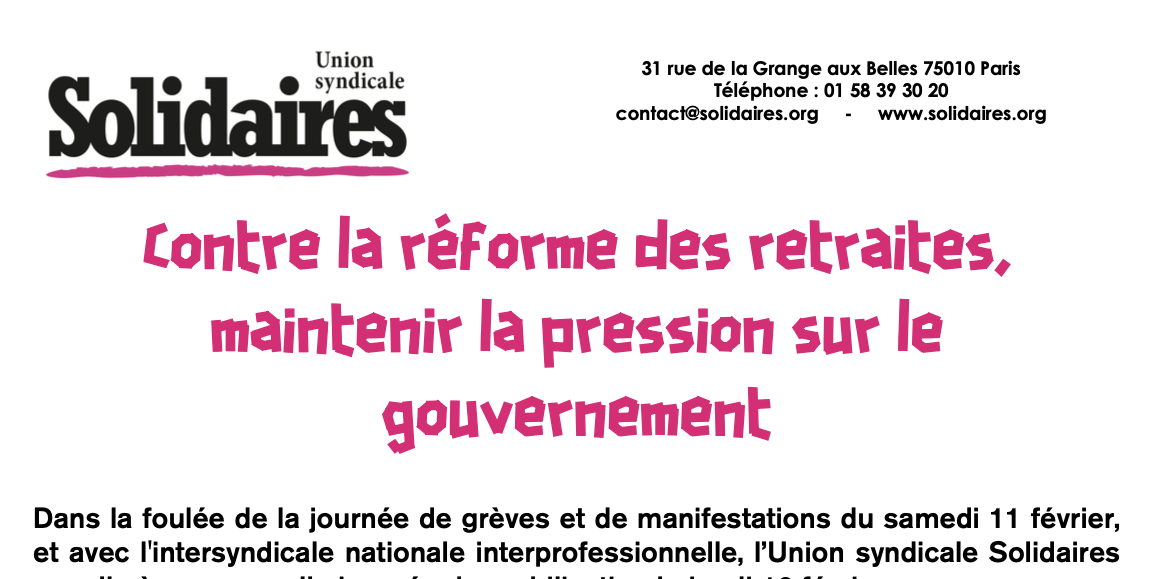 Dans la foulée de la journée de grèves et de manifestations du samedi 11 février, et avec l'intersyndicale nationale interprofessionnelle, l’Union syndicale Solidaires appelle à une nouvelle journée de mobilisation le jeudi 16 février.
