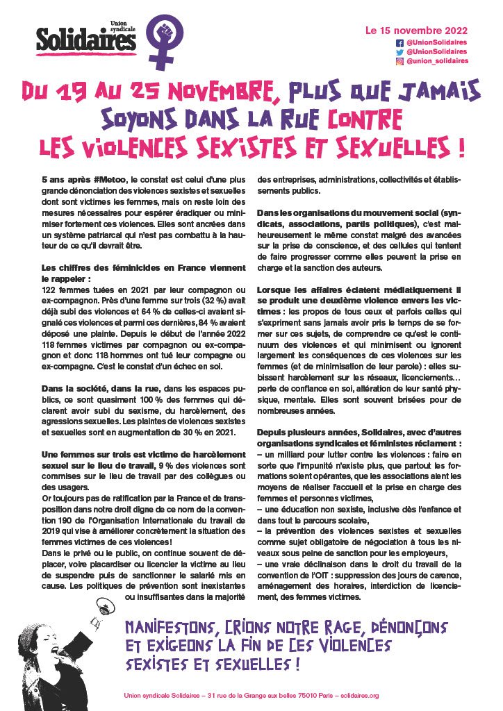 Depuis plusieurs années, Solidaires, avec d’autres organisations syndicales et féministes réclament :