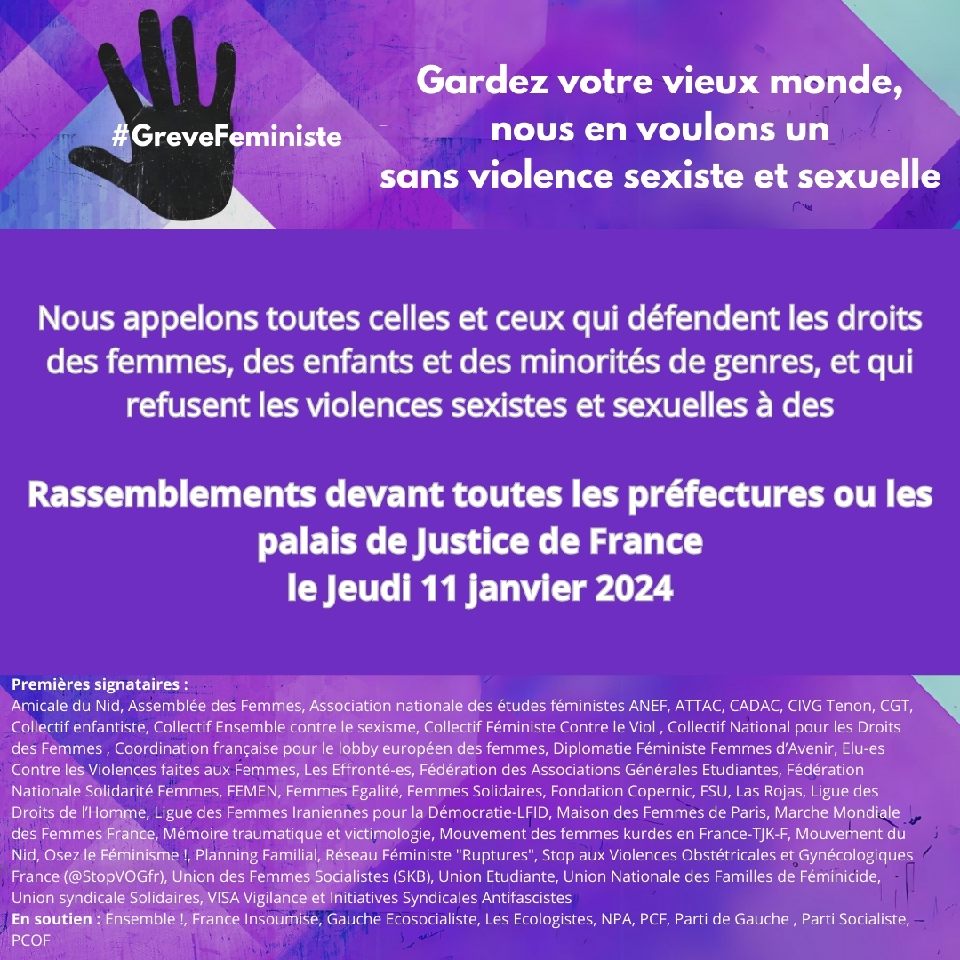 Nous appelons toutes celles et ceux qui défendent les droits des femmes, des enfants et des minorités de genres, et qui refusent les violences sexistes et sexuelles à des rassemblements devant toutes les préfectures ou les palais de Justice de France le Jeudi 11 janvier 2024.