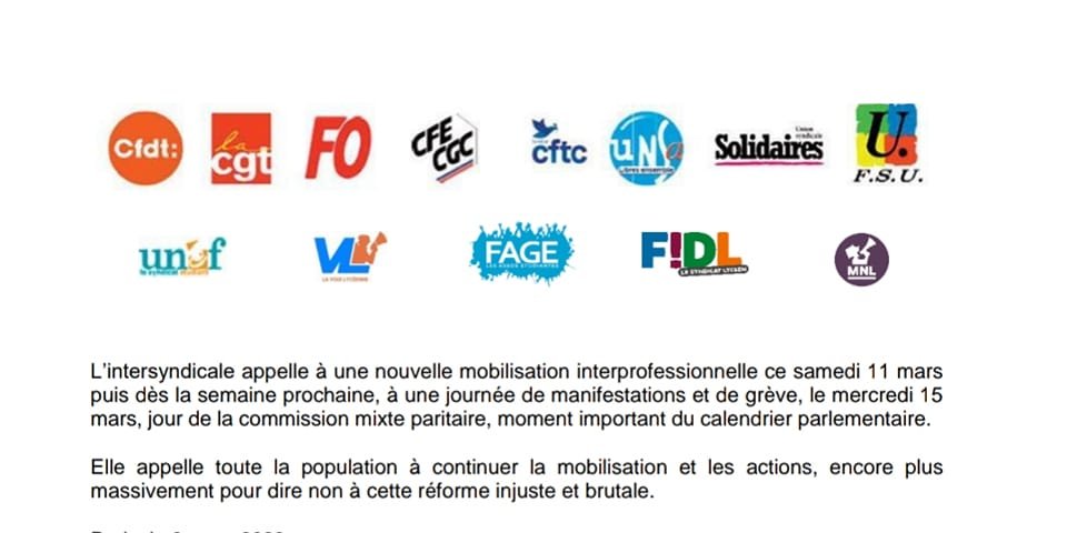 L’intersyndicale appelle à une nouvelle mobilisation interprofessionnelle ce samedi 11 mars puis dès la semaine prochaine, à une journée de manifestations et de grève, le mercredi 15 mars, jour de la commission mixte paritaire, moment important du calendrier parlementaire.