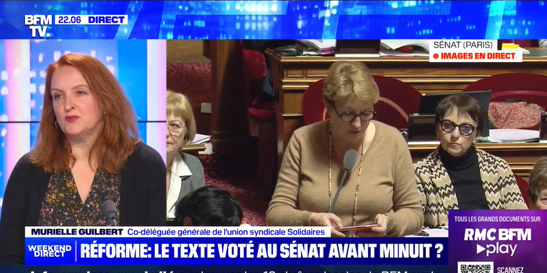 3 vidéos pour visionner les différentes interventions de BFM TV de Murielle Guilbert, co-déléguée générale de l'Union Syndicale Solidaires, le 11 mars de 22h à 23h :