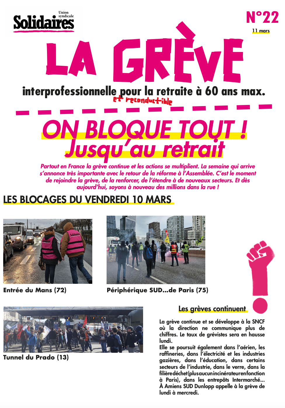 Partout en France la grève continue et les actions se multiplient. La semaine qui arrive s’annonce très importante avec le retour de la réforme à l’Assemblée. C’est le moment de rejoindre la grève, de la renforcer, de l’étendre à de nouveaux secteurs. Et dès aujourd’hui, soyons à nouveau des millions dans la rue !
