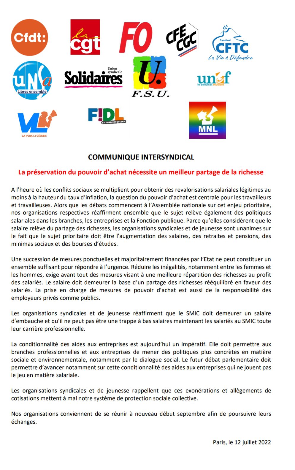 Nos organisations conviennent de se réunir à nouveau début septembre afin de poursuivre leurs échanges.