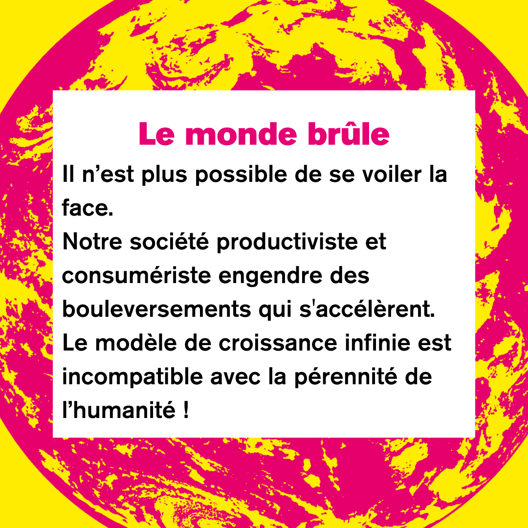 Il n’est plus possible de se voiler la face. Notre société productiviste et consumériste engendre des bouleversements qui s'accélèrent. Le modèle de croissance infinie est incompatible avec la pérennité de l’humanité !